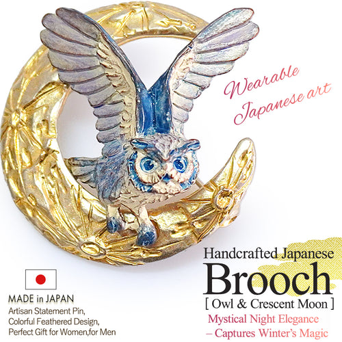 Handcrafted Japanese Crescent Moon & Owl Brooch – Artisan Pewter Pin, Mystical Night Forest Design, Perfect Gift for Women, for Men