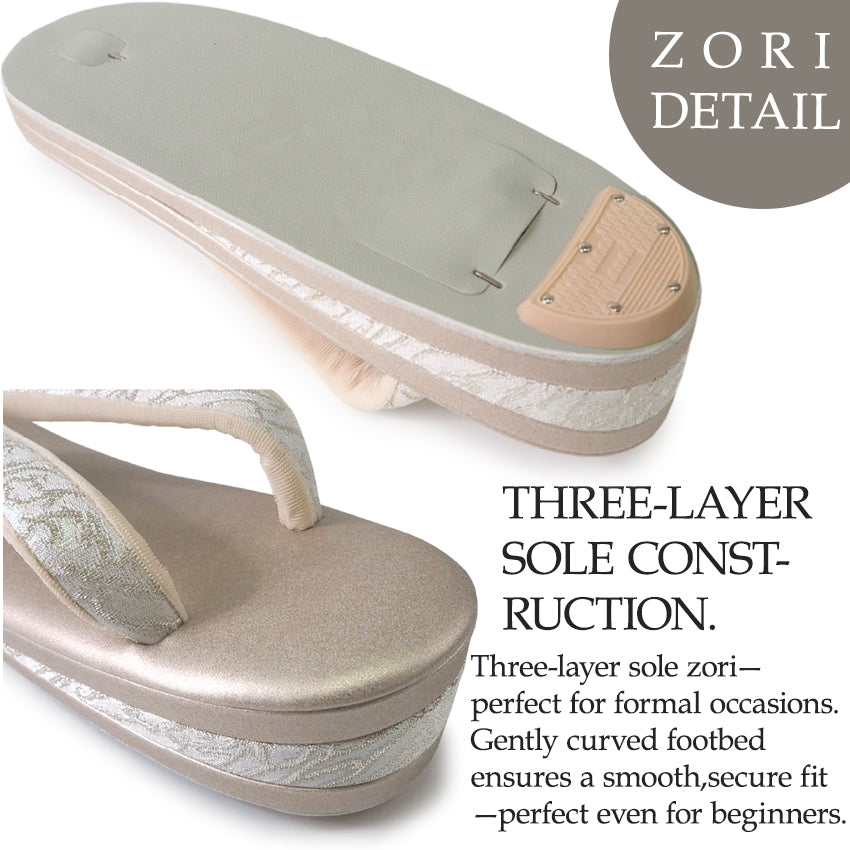 1x Bag 1x Zori : Formal-grade three-layer core zori with velvet underside and strap backing designed to reduce discomfort |