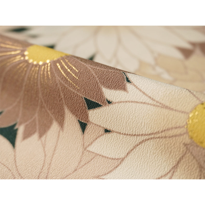 This ready-to-wear komon kimono features a deep green base richly filled with large beige chrysanthemums. Subtle gold accents scattered at the flower centers add a touch of elegance and depth.