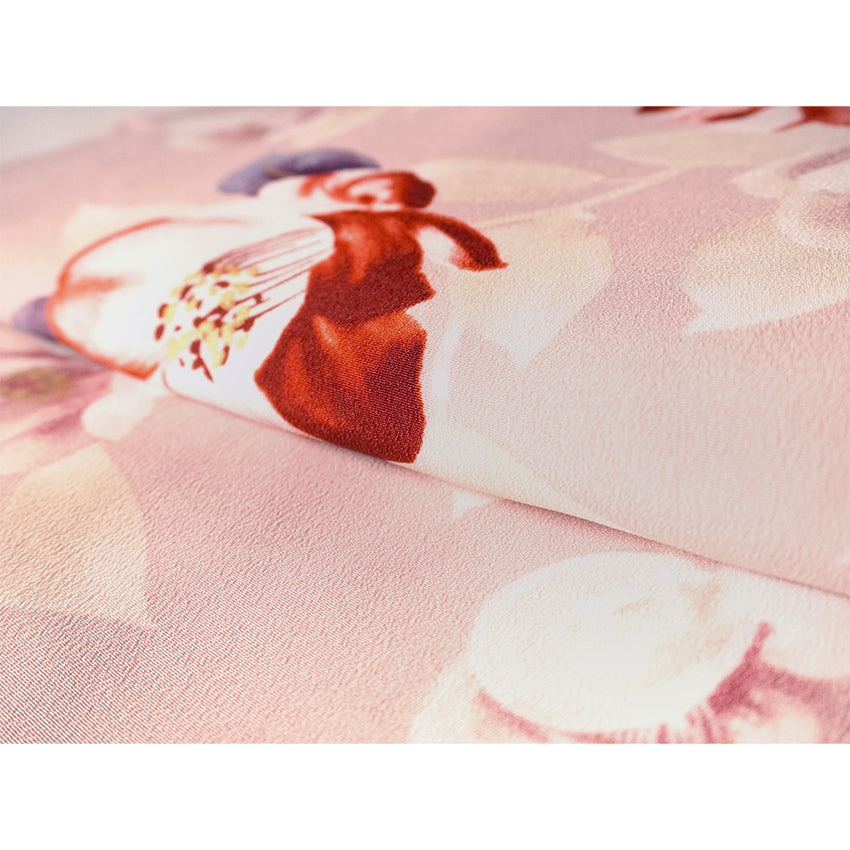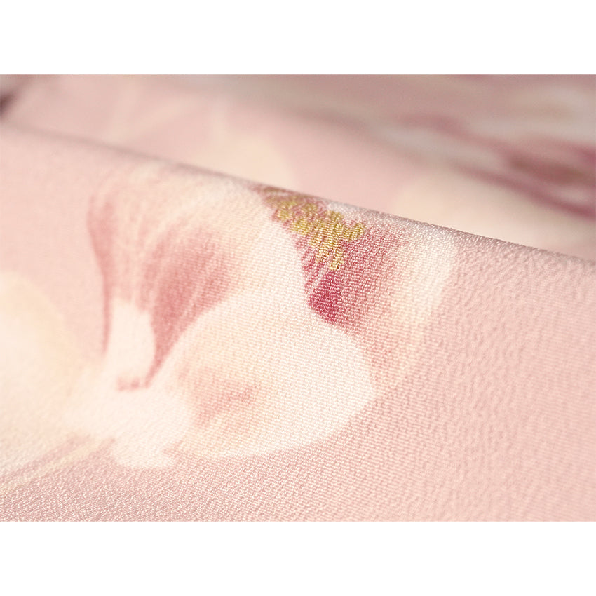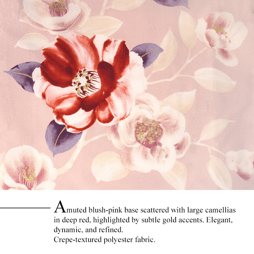 "A soft pink kimono with bold camellias—dynamic elegance touched with subtle gold."