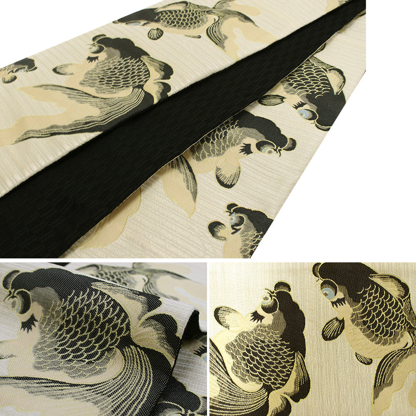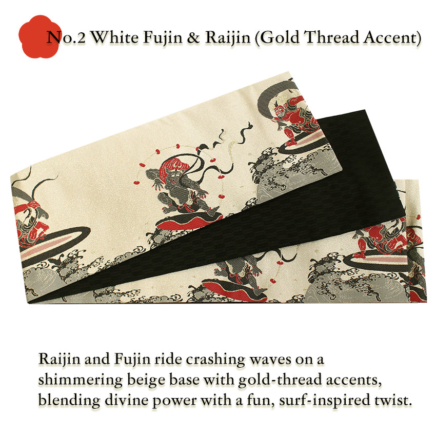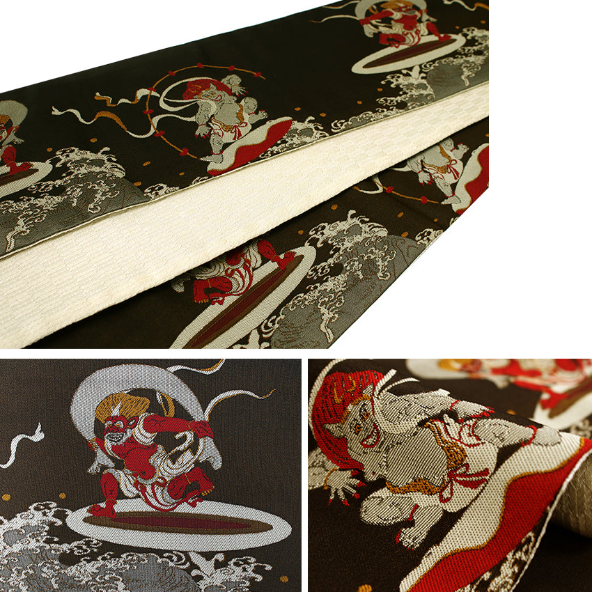 Bring bold Japanese style to your wardrobe with this reversible hanhaba obi from Kiryu, Japan—where traditional weaving meets modern design. Featuring striking motifs such as Fujin and Raijin (the Wind and Thunder Gods) and playful goldfish, each side tells a different visual story. Flip it to match your mood, or style it to reveal both patterns for a dynamic, eye-catching look.