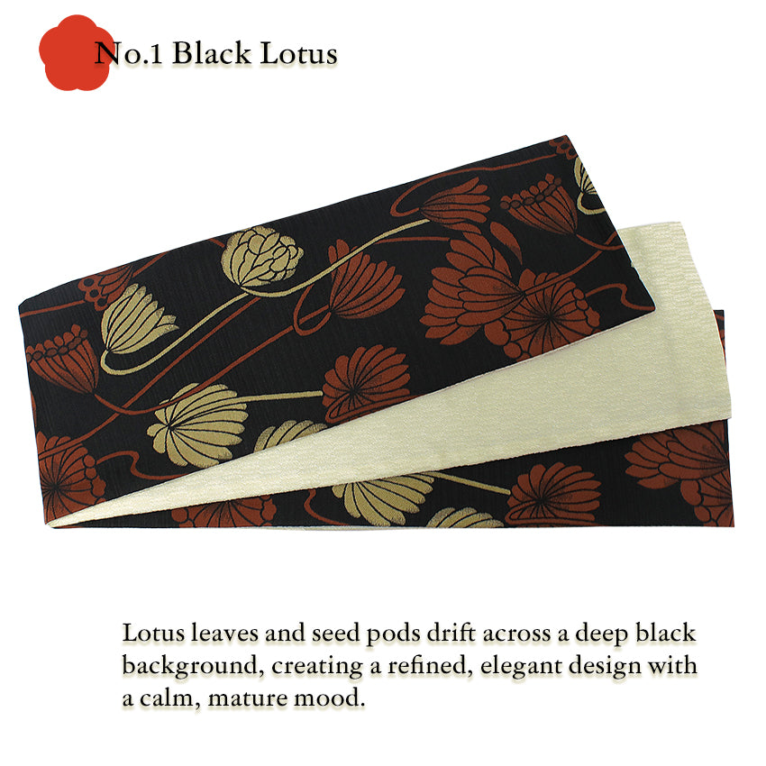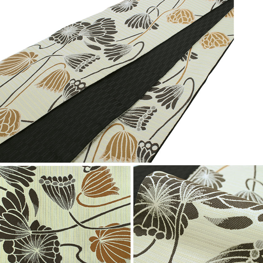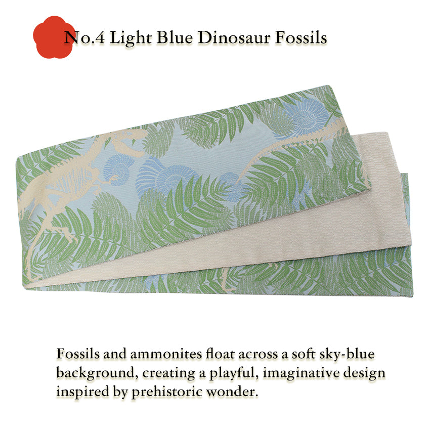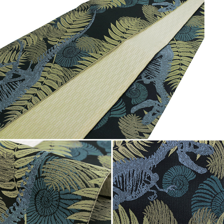 Make a statement with this reversible hanhaba obi from Kiryu, Japan—where tradition meets playful modern design. One side features elegant lotus flowers for a refined, classic look, while the other showcases whimsical dinosaur fossils and fern motifs for a bold, unexpected twist.