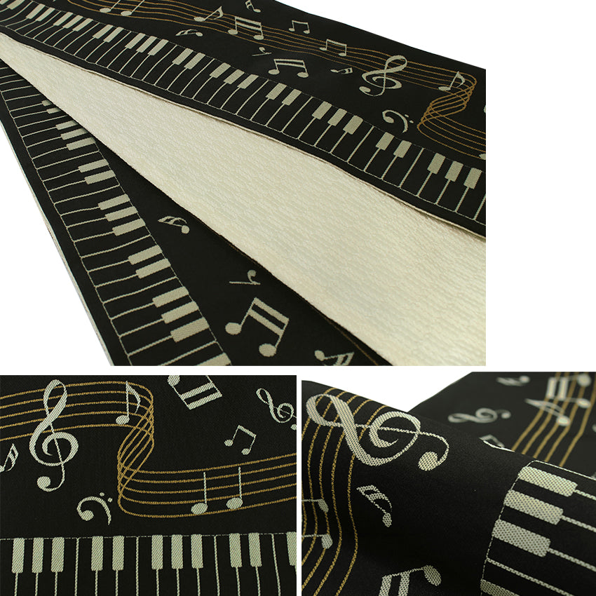 Front: Piano keys and musical notes on black