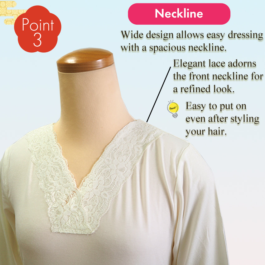 A one-piece thermal kimono underdress engineered for Japanese winter layering. Using Soft-Thermo yarn, it converts your body’s moisture to gentle heat while trapping warmth. Ultra-thin stretch lace around the neck fits smoothly. Side slits and anti-static finish make movement easy. Inspired by Kyoto’s kimono artisans, this innerwear is your elegant solution to staying cozy beneath your favorite kimono.