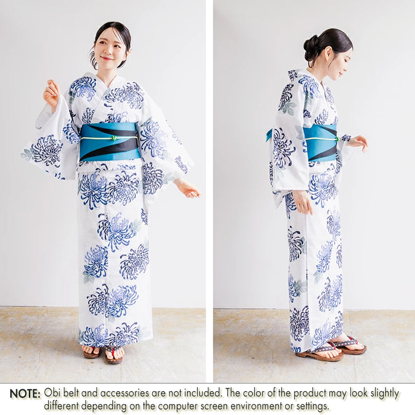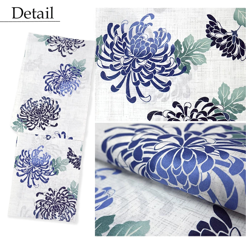 White base adorned with scattered chrysanthemums in blue and black. Soft gray, textured shading gives a lightly worn, airy feel, creating a cute, refreshing, and summery Yukata.