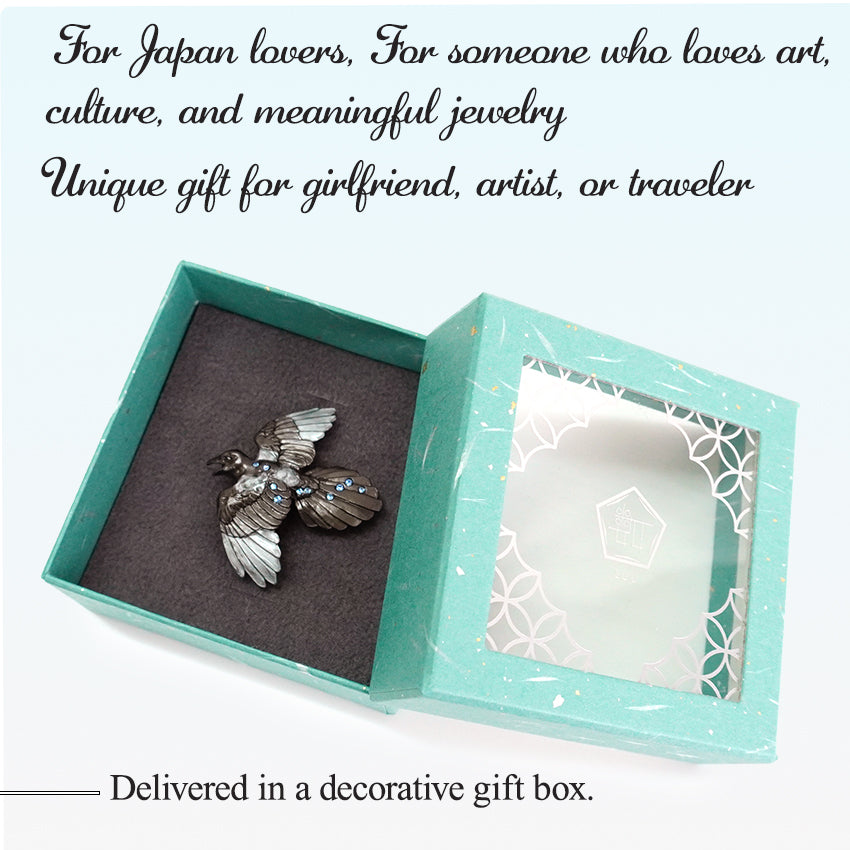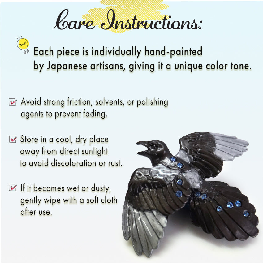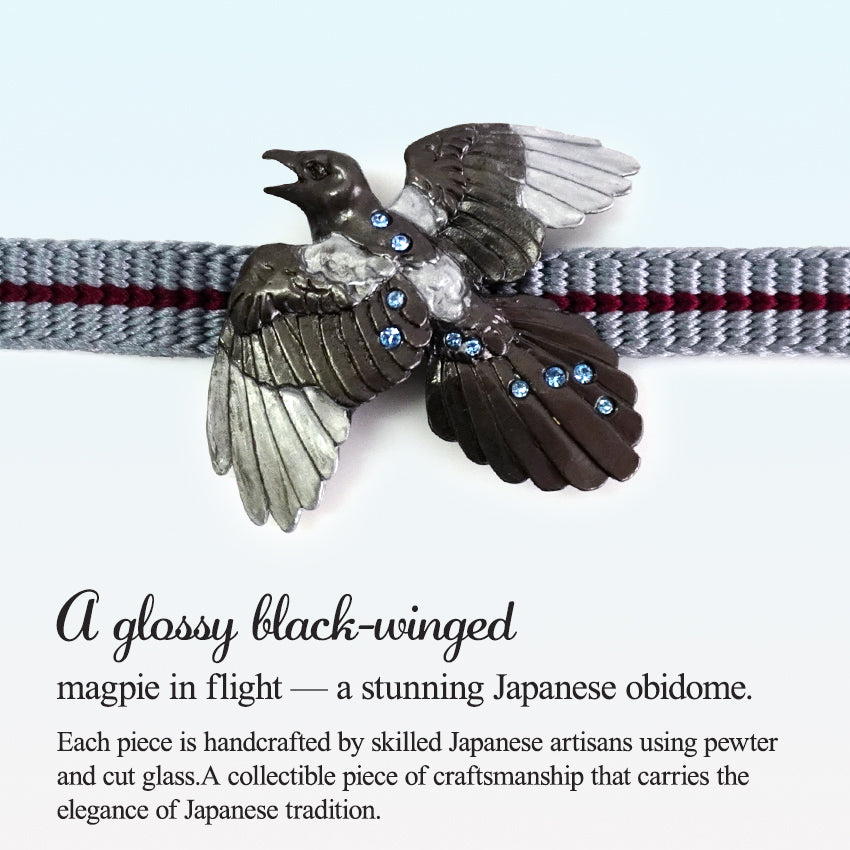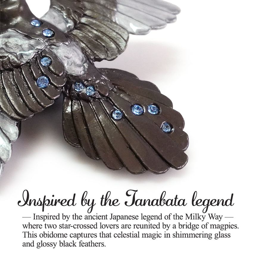 Inspired by the romantic Tanabata legend, this obidome features a magpie that bridges the Milky Way. Glossy black feathers and sparkling cut-glass stars evoke a celestial night sky. Each piece is handcrafted in Japan from pewter and glass, blending tradition and artistry. Though small, it brings a strong statement of elegance. Wear it on your obi, scarf, or lapel — a true piece of wearable Japanese art.