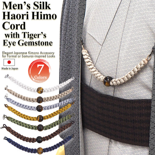 Men’s Silk Haori Himo Cord with Tiger’s Eye Gemstone – Hand-Braided Japanese Jacket Tie for Samurai-Inspired or Formal Kimono Style