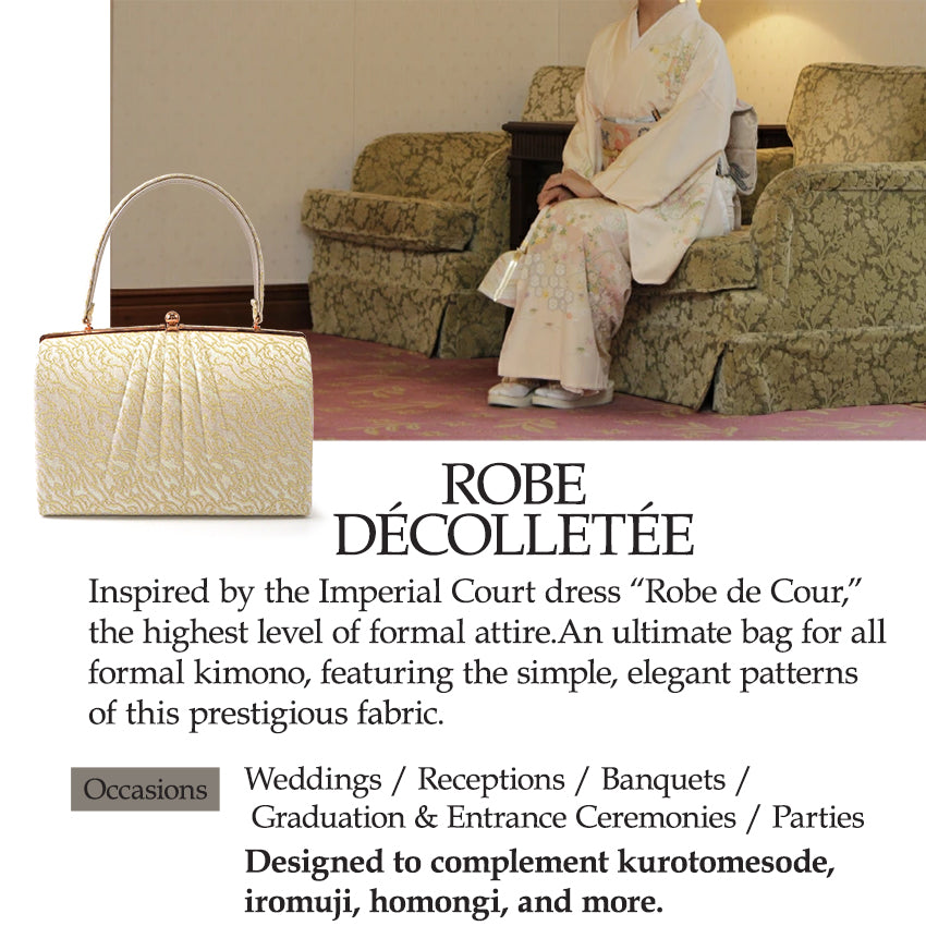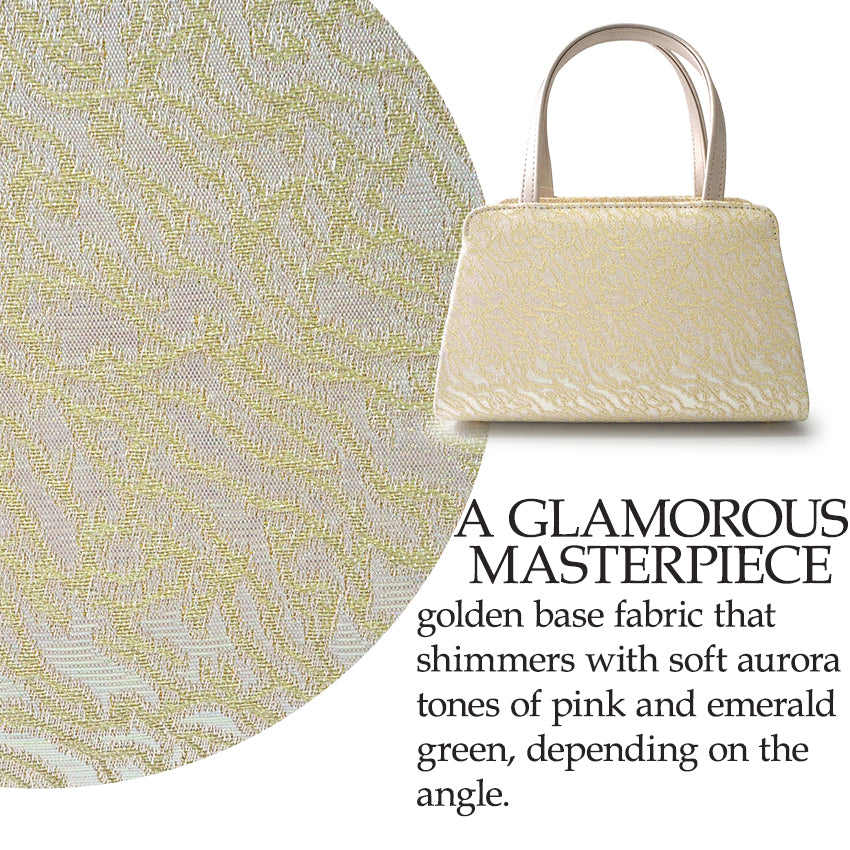 The “Robe décolletée Bag” transforms the exquisite fabric of Japan’s highest ceremonial dress into a refined formal bag. Inspired by the royal court style of open décolleté dresses, the design features aurora-illuminated and metallic gold & silver motifs, rendering an elegant shimmer. Sized to carry essentials—wallet, smartphone, and lipstick—this compact balances beauty and practicality. Ideal for weddings, formal ceremonies, or traditional kimono events, it complements tomesode, furisode and other highest-level attire, making it a timeless accessory for those who cherish Japanese elegance.