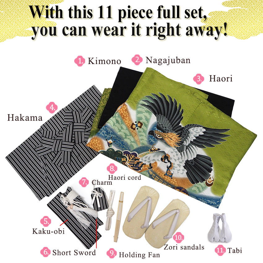 Complete 11-Piece Set Includes: Haori, Kimono, Juban (undershirt), Hakama, Obi, Haori Cord, Short Sword, Charm, Folding Fan, Sandals, Stretch Tabi Socks |