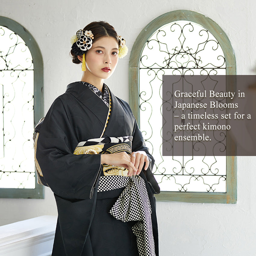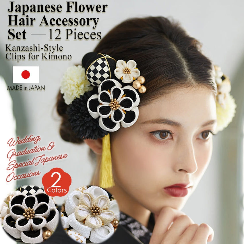 “Make your kimono moment unforgettable with 12 exquisite Japanese flower clips and gold tassel!”