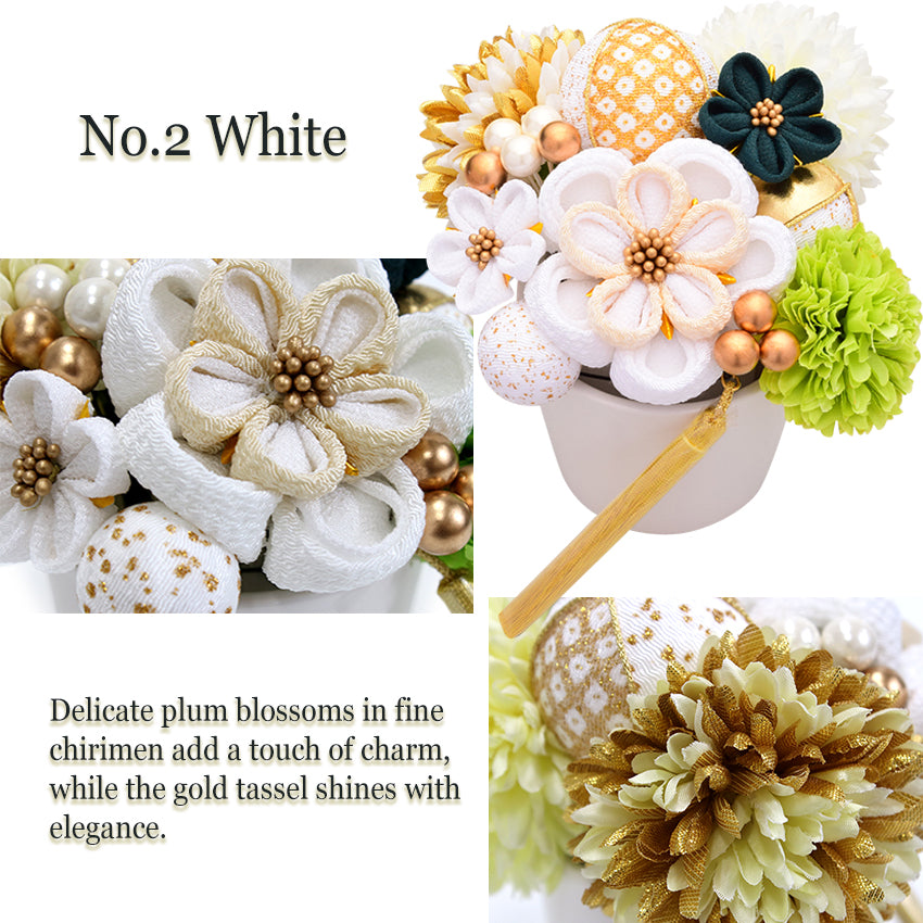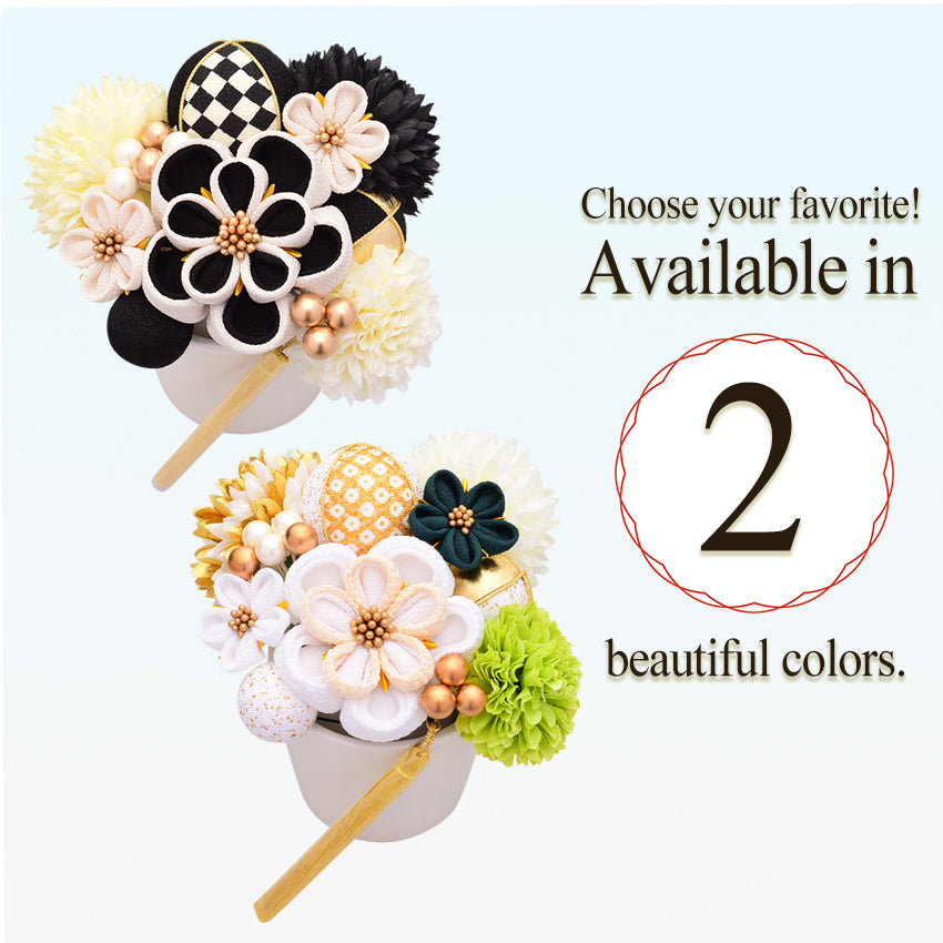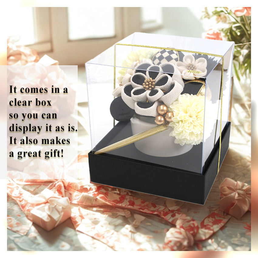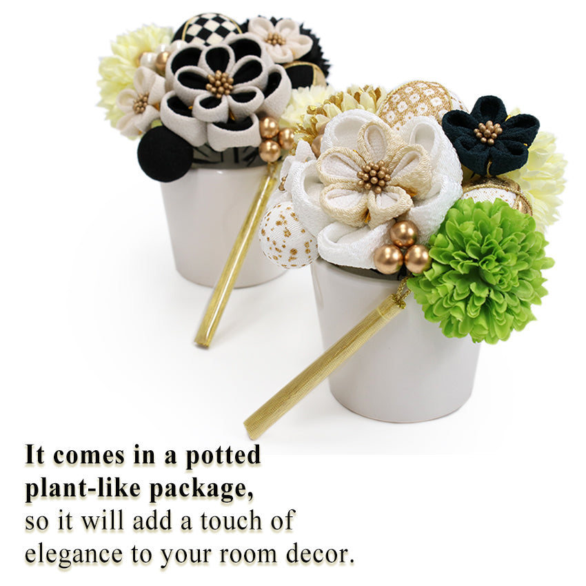 This 12-piece Japanese hair ornament set brings vibrant peony flowers with a subtle gradient and an elegant gold tassel to your kimono look. Each piece is individually styled for flexible arrangement—ideal for coming-of-age ceremonies, graduations or wedding kimonos. The charming pot-style packaging also serves as an elegant decorative accent in your room. Insert the clips effortlessly for a glamorous finish. U-pin type. Please note: Chirimen ball colors and patterns may vary by production.