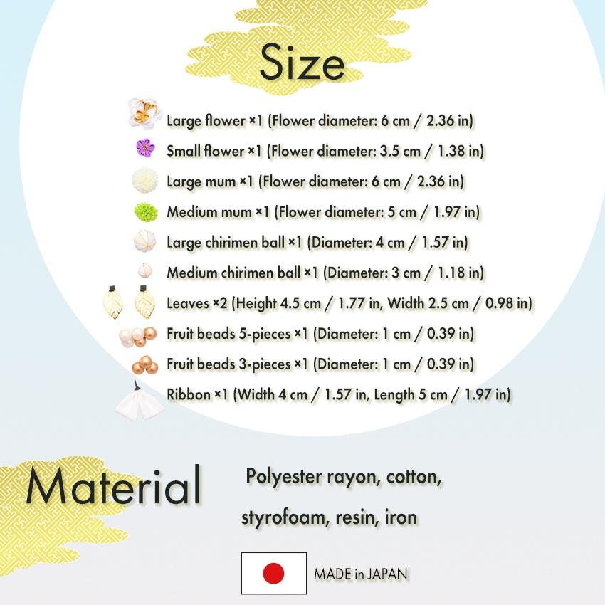 Enhance your kimono ensemble with this 11-piece floral hair accessory set, designed for Coming-of-Age Day, graduations, weddings, and other traditional occasions. Featuring a refined chirimen ribbon, gold-accented peony and plum blossom tsumami-kanzashi, and luxurious chirimen balls, each piece can be arranged freely to create a personalized look. Simply insert where you like for an effortless, gorgeous style. Perfect for fursode, hakama, or any formal kimono.