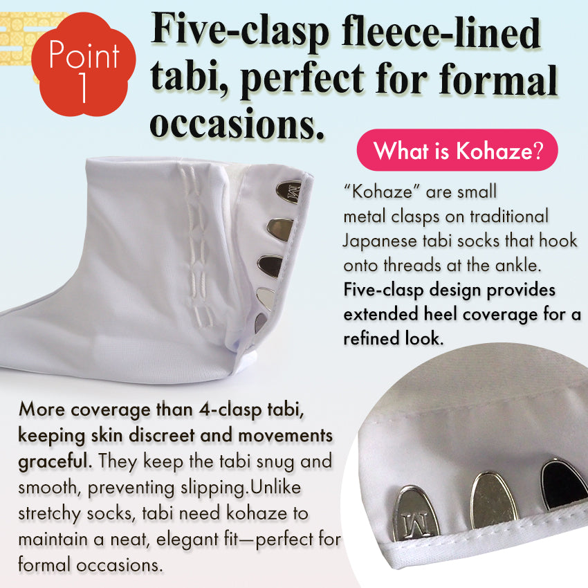 Experience ultimate comfort with these Nylon Stretch Tabi Socks with 5 hooks. Soft, flexible fabric hugs your feet without tightness, stretching naturally for sitting, kneeling, or walking. The 5 hooks ensure your ankles stay covered, even on stairs. Machine-washable and no ironing needed, these white tabi stay fresh and convenient for everyday use or traditional occasions. Perfect for kimono enthusiasts who value both tradition and modern comfort.