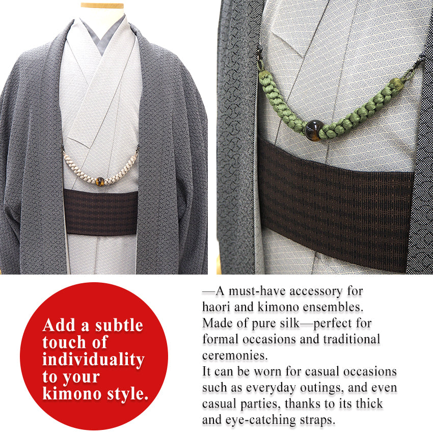 Men’s Silk Haori Himo Cord with Tiger’s Eye Gemstone – Hand-Braided Japanese Jacket Tie for Samurai-Inspired or Formal Kimono Style