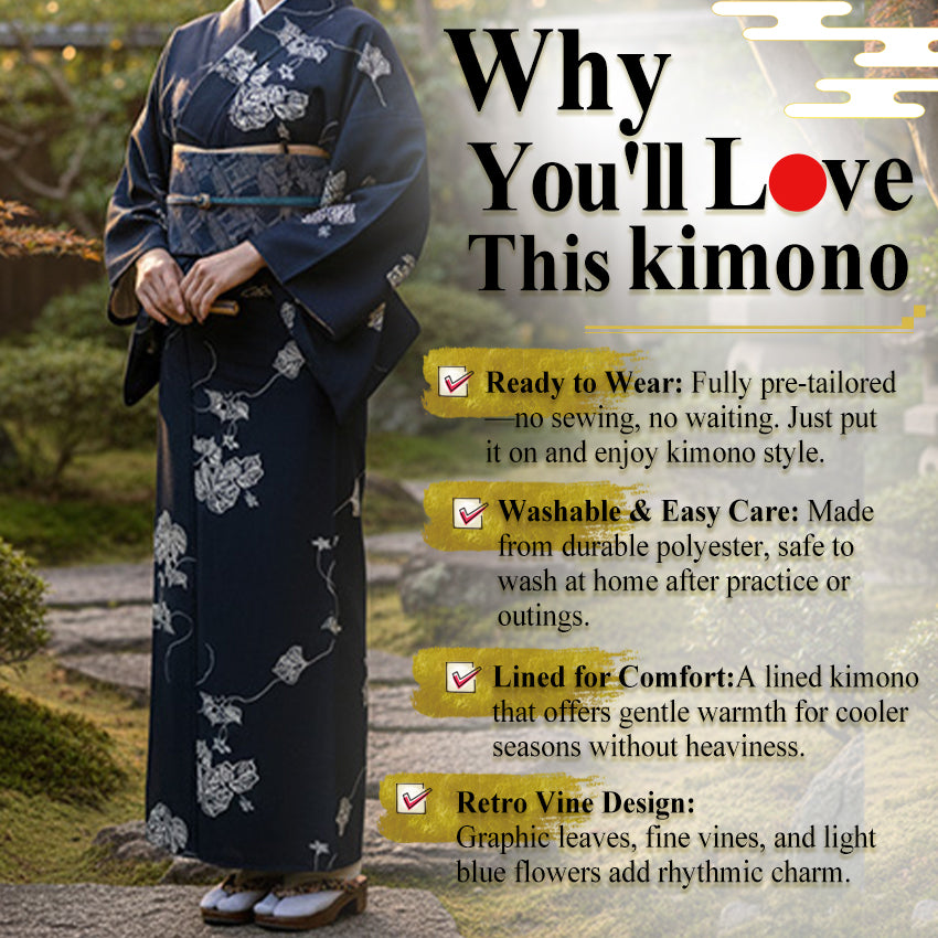 Ready-to-Wear Washable Komon Kimono for Women, Fully Lined Polyester, Deep Navy with Retro Vine Motif – A Sophisticated Komon Kimono with Timeless Elegance