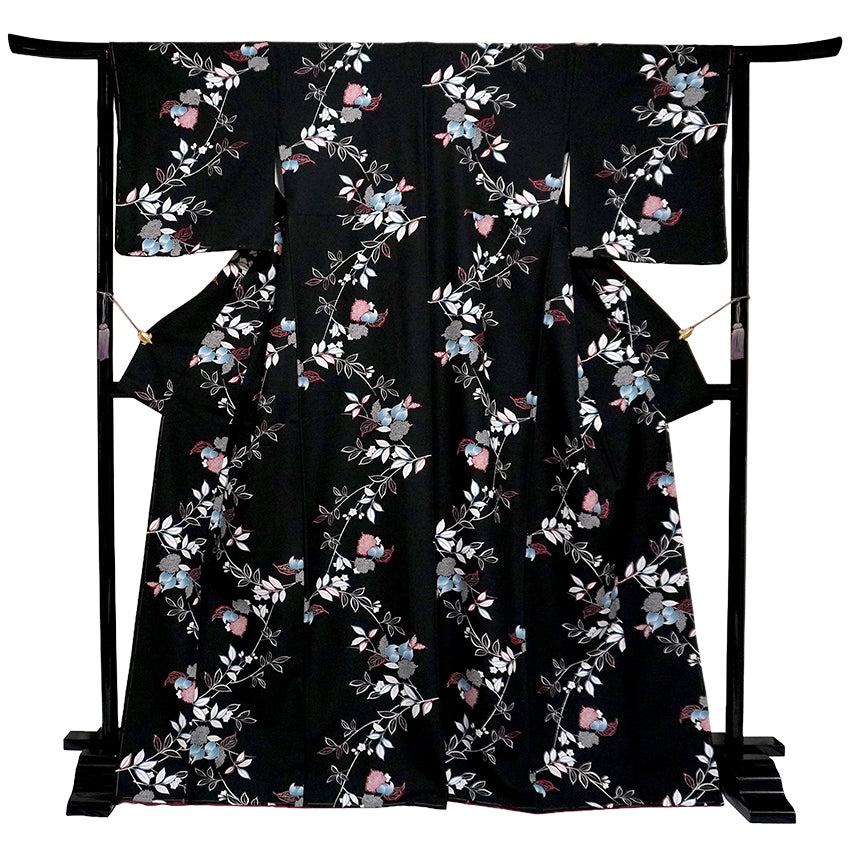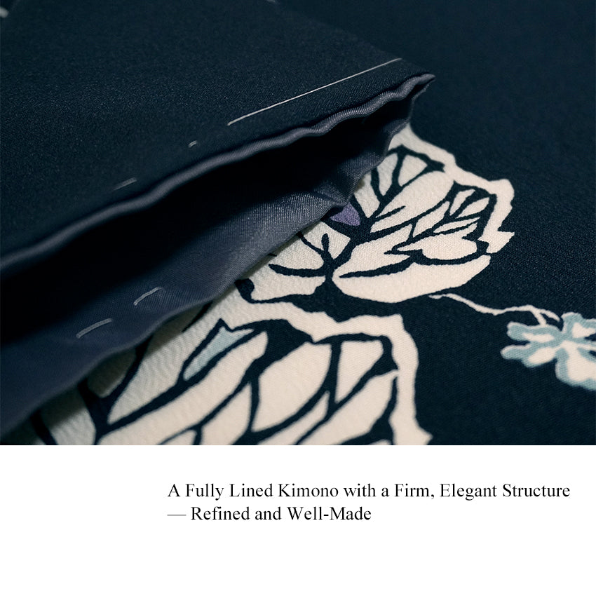This ready-to-wear komon kimono features a deep, green-tinged navy base decorated with a charming retro vine motif reminiscent of paper-cut designs. Bold leaves, delicate vines, and small light blue flowers create a rhythmic, stylish pattern that feels playful yet refined.