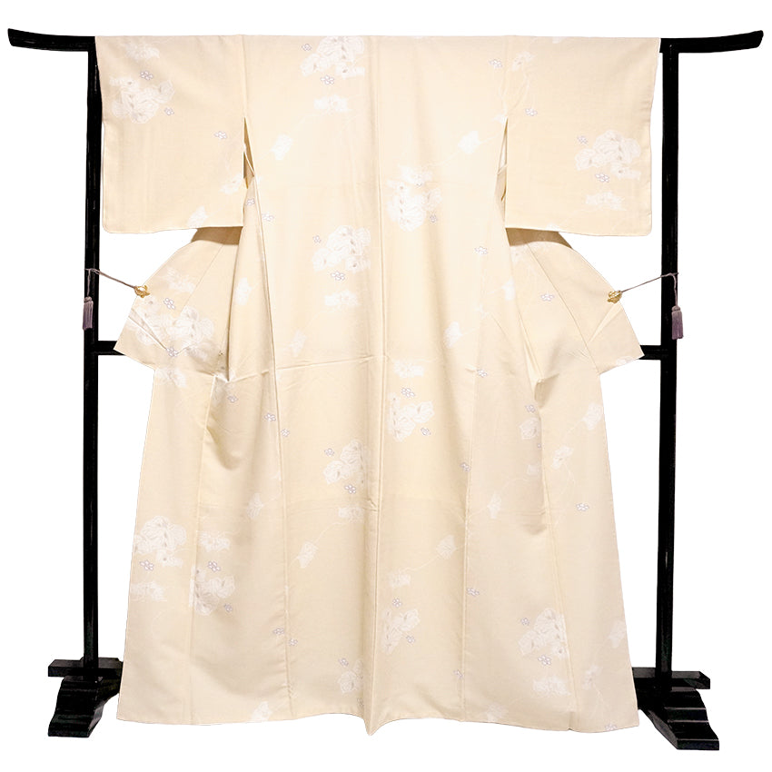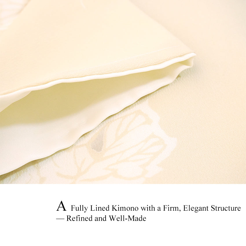 "A soft cream-yellow kimono with charming retro vines—simple, sweet, and effortlessly elegant."
