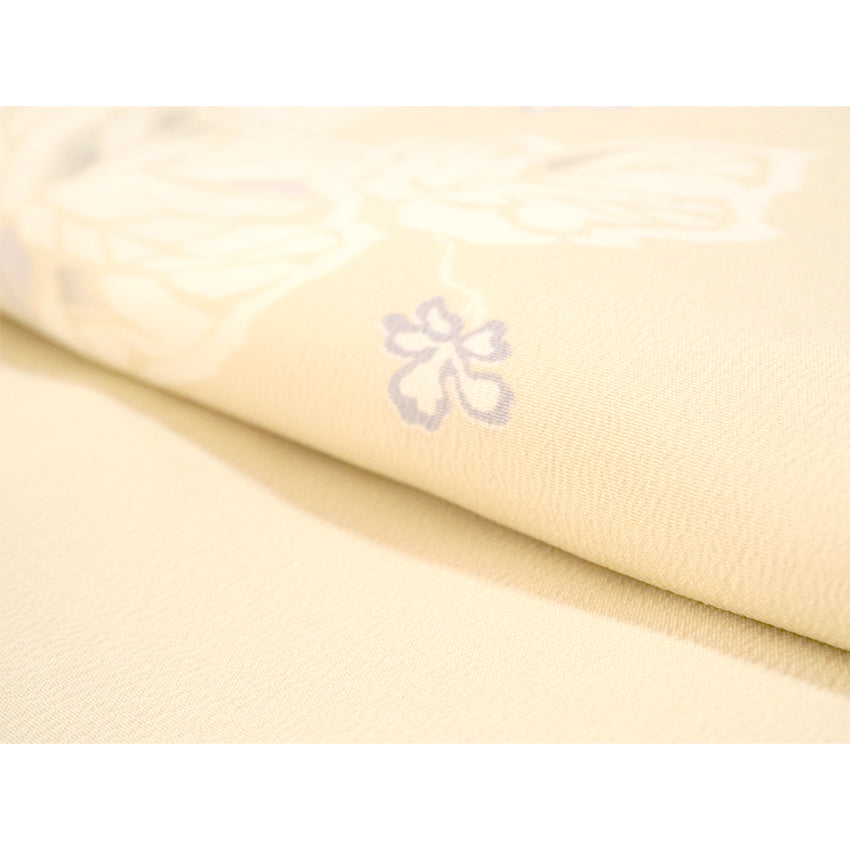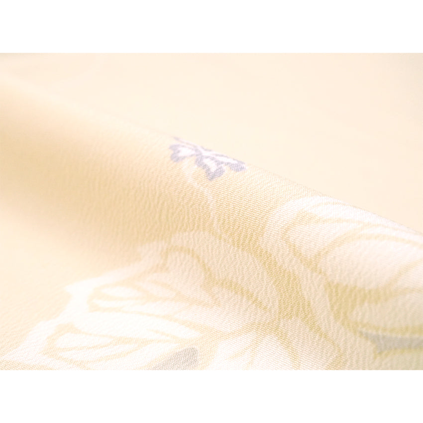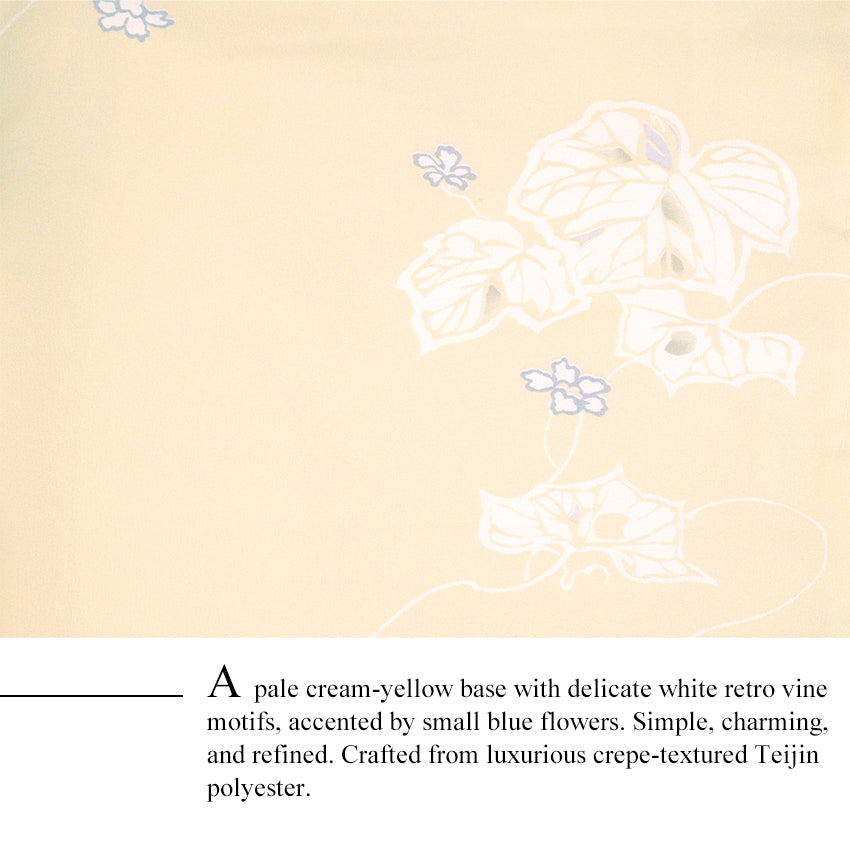 A pale cream-yellow base with delicate white retro vine motifs, accented by small blue flowers. Simple, charming, and refined. Crafted from luxurious crepe-textured Teijin polyester.